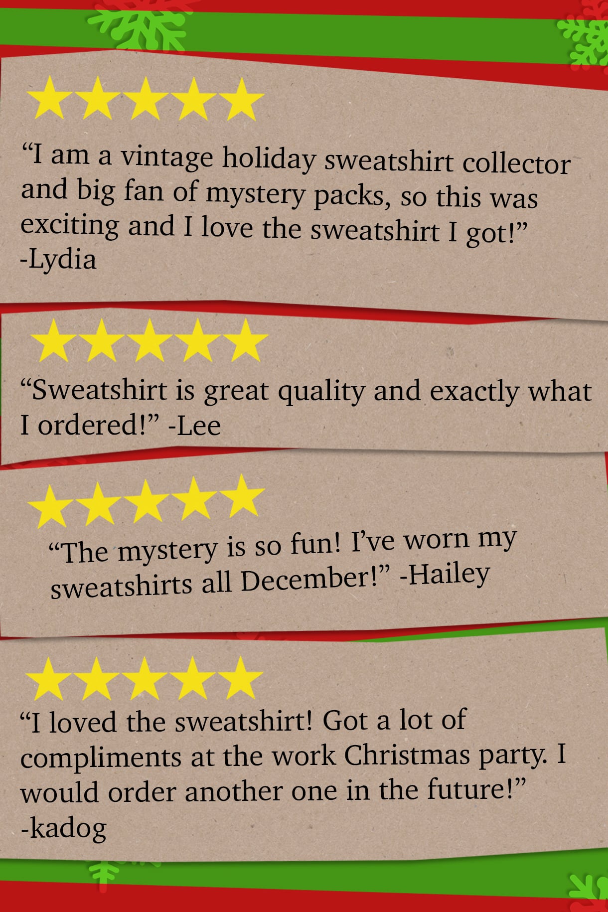 Each Mystery Ugly Sweatshirt package contains one (1) assorted sweatshirt hand-picked by our dedicated staff of vintage Christmas enthusiasts!