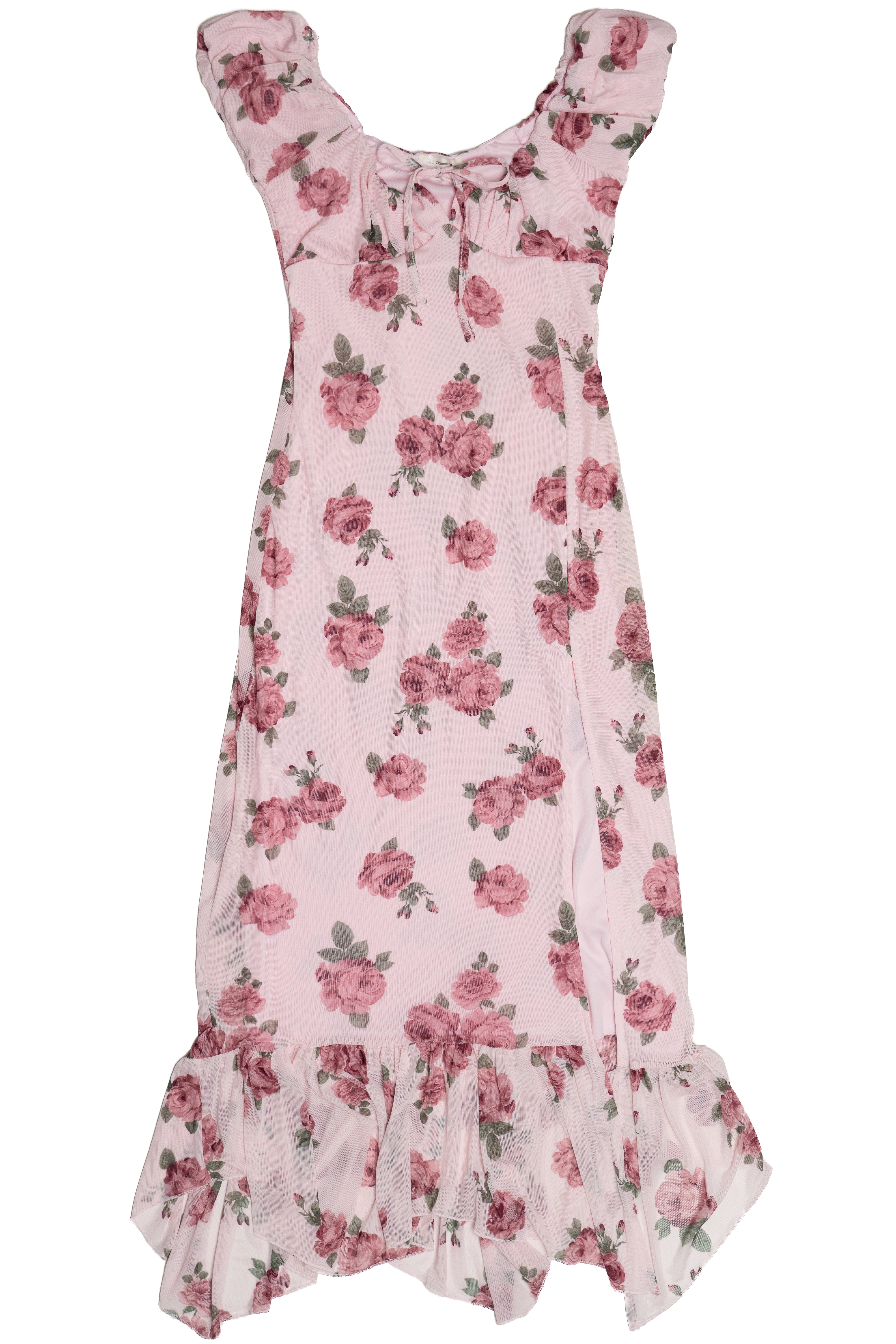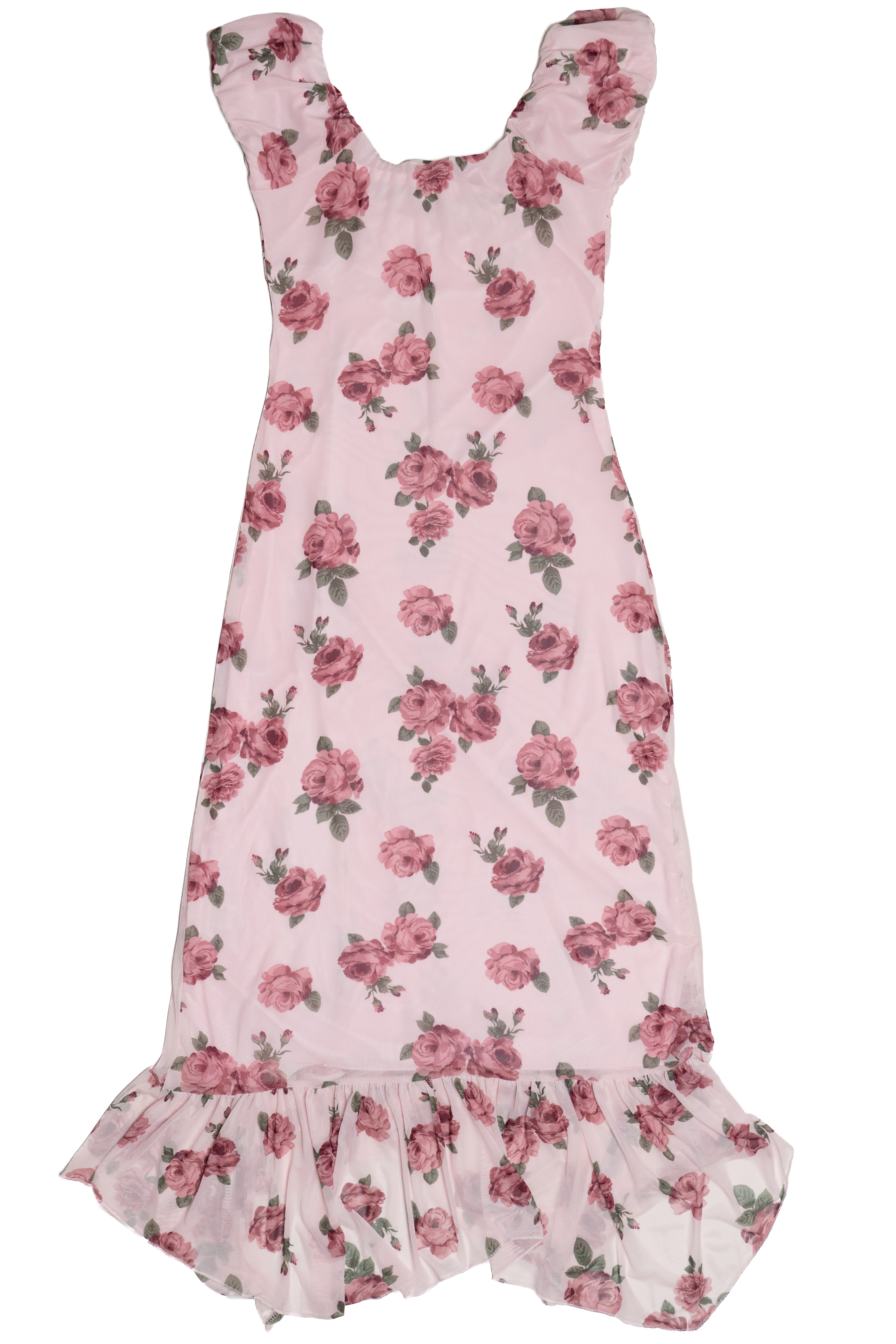 Mesh Puff Sleeve Hanky Hem Maxi Dress